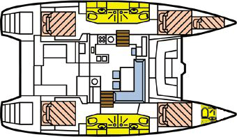 Ihr Katamaran hat einen Salon („Wohnzimmer“) mit integriertem Küchenteil sowie ein großes, gegen Wind und starke Sonneneinstrahlung geschütztes Cockpit. Hier wird sich das gemeinsame Bordleben hauptsächlich abspielen.