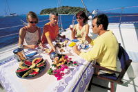 Die Mahlzeiten werden gemeinsam eingenommen. Es wird vorwiegend im Cockpit eingedeckt. Getränke an Bord (im Preis enthalten): ganztags stilles Wasser, Kaffee, Tee.